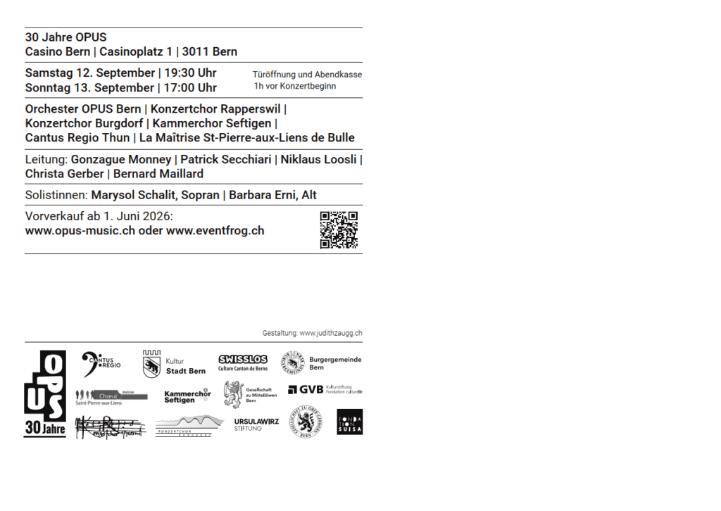 Samstag, 6. Juni9:30–13:00 Uhr: Zusätzliche Probe für das OPUS-Programm im Kirchgemeindehaus (Saal noch nicht bestätigt)